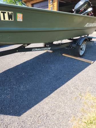 Alumacraft 14' by 48" wide Jon boat with Suzuki 15hp 4-stroke outboard. Also comes with a minn kota 30lb thrust trolling motor. Karavan KBE-1250-46 single axle trailer. Outboard has barely been broken in and I would guess has approx 30 hours on it. Has pull start and electric start. Total package new was $7,000. Comes with oars, transom saver, and 2 portable seats. Has a discoloration on the rear bench from a gasoline spill.