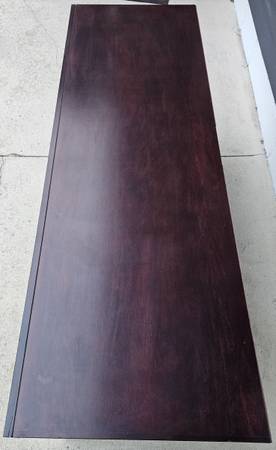 Nice sized TV stand in a cherry finish. It has a total of 3 adjustable shelves. The top has some small scratches, particularly on one end near the back that are pictured. It is a very sturdy piece of furniture. 19 7/8" deep, 60" wide, and 27 1/4" tall. Delivery may be available. $120